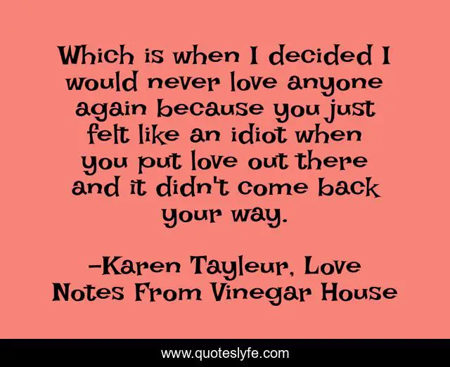 This page presents the quote "Which is when I decided I would never love anyone again because you just felt like an idiot when you put love out there and it didn't come back your way.". Author of this quote is Karen Tayleur, Love Notes From Vinegar House. This quote is about idiot, decide, love, unrequited-love, affection,.