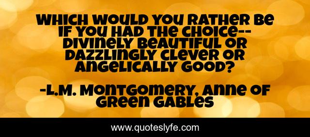 This page presents the quote "Which would you rather be if you had the choice--divinely beautiful or dazzlingly clever or angelically good?". Author of this quote is L.M. Montgomery, Anne of Green Gables. This quote is about beauty, cleverness, good-looks, questions, choice,.
