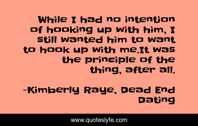 This page presents the quote "While I had no intention of hooking up with him, I still wanted him to want to hook up with me.It was the principle of the thing, after all.". Author of this quote is Kimberly Raye, Dead End Dating. This quote is about contemporary-comedy, paranormal-romance,.