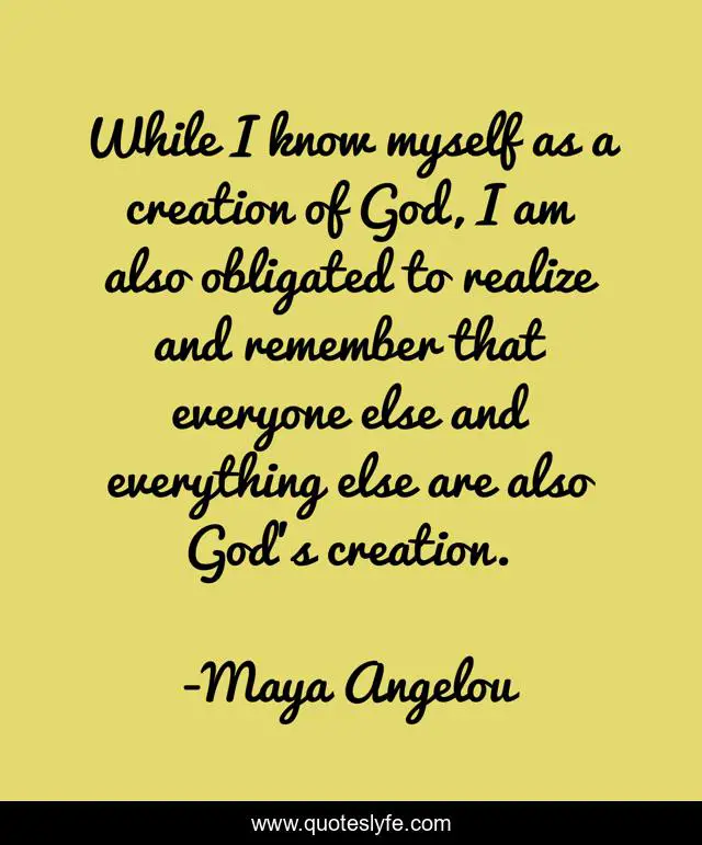 This page presents the quote "While I know myself as a creation of God, I am also obligated to realize and remember that everyone else and everything else are also God's creation.". Author of this quote is Maya Angelou. This quote is about myself, remember,.