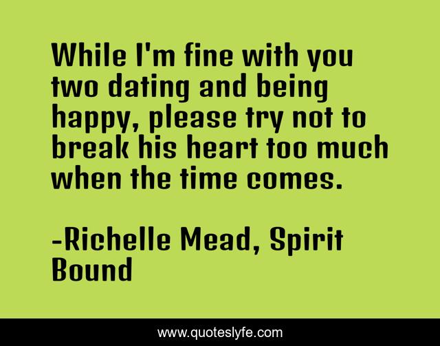 This page presents the quote "While I'm fine with you two dating and being happy, please try not to break his heart too much when the time comes.". Author of this quote is Richelle Mead, Spirit Bound. This quote is about love, rose-hathaway, heartbreak, adrian-ivashkov, daniella-ivashkov, affection,.