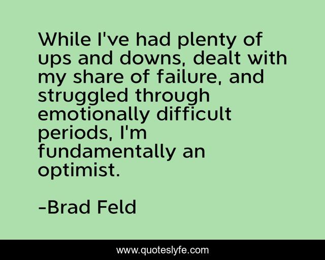 This page presents the quote "While I've had plenty of ups and downs, dealt with my share of failure, and struggled through emotionally difficult periods, I'm fundamentally an optimist.". Author of this quote is Brad Feld. This quote is about ups and downs, difficult,.