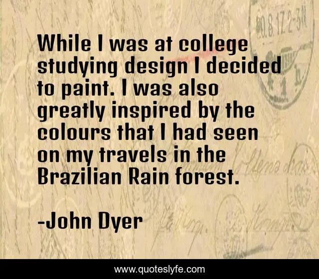 This page presents the quote "While I was at college studying design I decided to paint. I was also greatly inspired by the colours that I had seen on my travels in the Brazilian Rain forest.". Author of this quote is John Dyer. This quote is about college, forest, rain,.