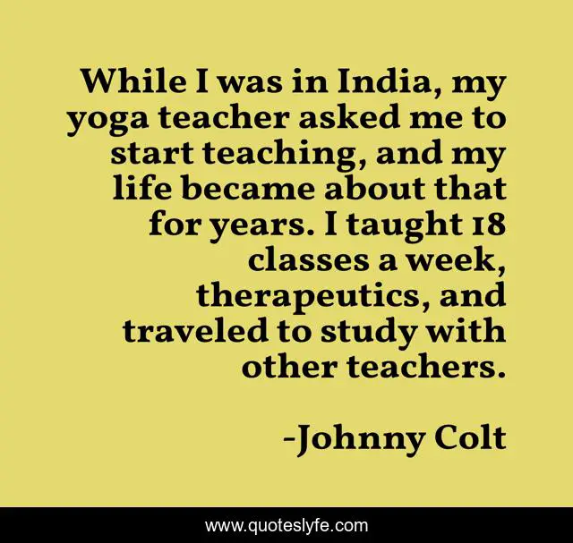 This page presents the quote "While I was in India, my yoga teacher asked me to start teaching, and my life became about that for years. I taught 18 classes a week, therapeutics, and traveled to study with other teachers.". Author of this quote is Johnny Colt. This quote is about week, me, life,.