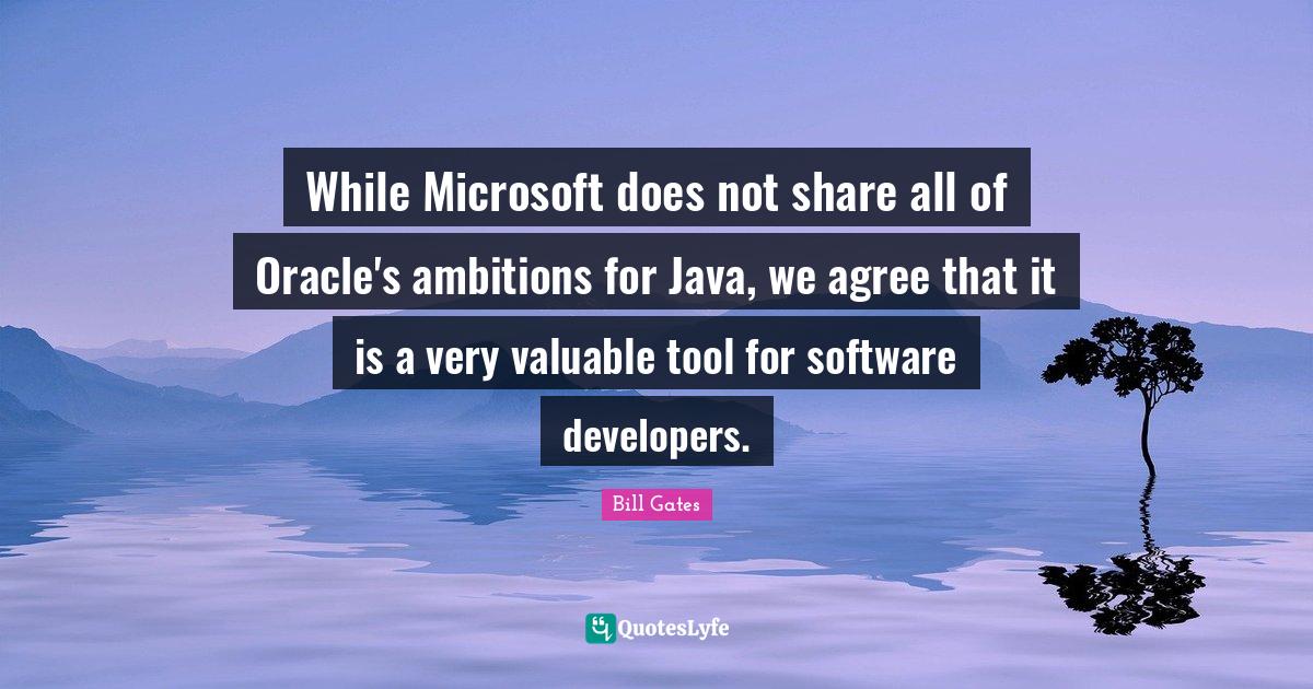 This page presents the quote "While Microsoft does not share all of Oracle's ambitions for Java, we agree that it is a very valuable tool for software developers.". Author of this quote is Bill Gates. This quote is about developers, share, software, valuable, java, microsoft, ambition, doe, tools,.