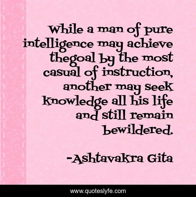 This page presents the quote "While a man of pure intelligence may achieve thegoal by the most casual of instruction, another may seek knowledge all his life and still remain bewildered.". Author of this quote is Ashtavakra Gita. This quote is about philosophy-of-religion, philosophy-of-life, vedanta,.