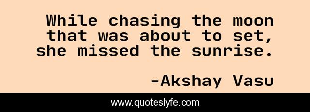 This page presents the quote "While chasing the moon that was about to set, she missed the sunrise.". Author of this quote is Akshay Vasu. This quote is about set, sun, rise, moon, miss, sunrise, chase,.