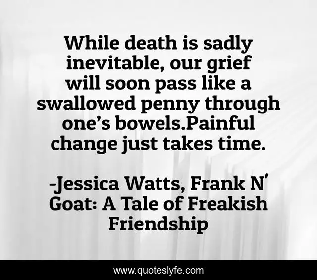 This page presents the quote "While death is sadly inevitable, our grief will soon pass like a swallowed penny through one’s bowels.Painful change just takes time.". Author of this quote is Jessica Watts, Frank N' Goat: A Tale of Freakish Friendship. This quote is about funny, humor, death-of-a-loved-one, comedy, death-and-dying, change,.
