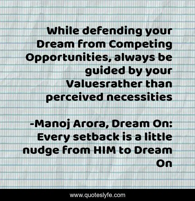 "Manoj Arora, Dream On: Every setback is a little nudge from HIM to Dream On Quotes." Quoteslyfe.com, 2025. Fri. 05 Dec. 2025. <https://www.quoteslyfe.com/quote/While-defending-your-Dream-from-Competing-Opportunities-54180>.