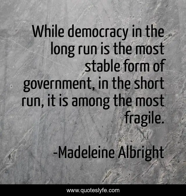 This page presents the quote "While democracy in the long run is the most stable form of government, in the short run, it is among the most fragile.". Author of this quote is Madeleine Albright. This quote is about short, democracy, long,.