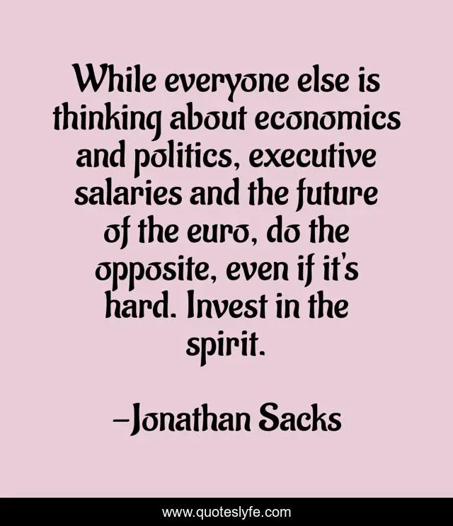 This page presents the quote "While everyone else is thinking about economics and politics, executive salaries and the future of the euro, do the opposite, even if it's hard. Invest in the spirit.". Author of this quote is Jonathan Sacks. This quote is about thinking, future, economics,.