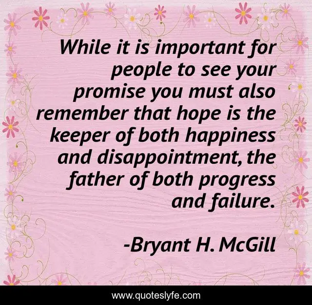 This page presents the quote "While it is important for people to see your promise you must also remember that hope is the keeper of both happiness and disappointment, the father of both progress and failure.". Author of this quote is Bryant H. McGill. This quote is about failure, father, happiness,.