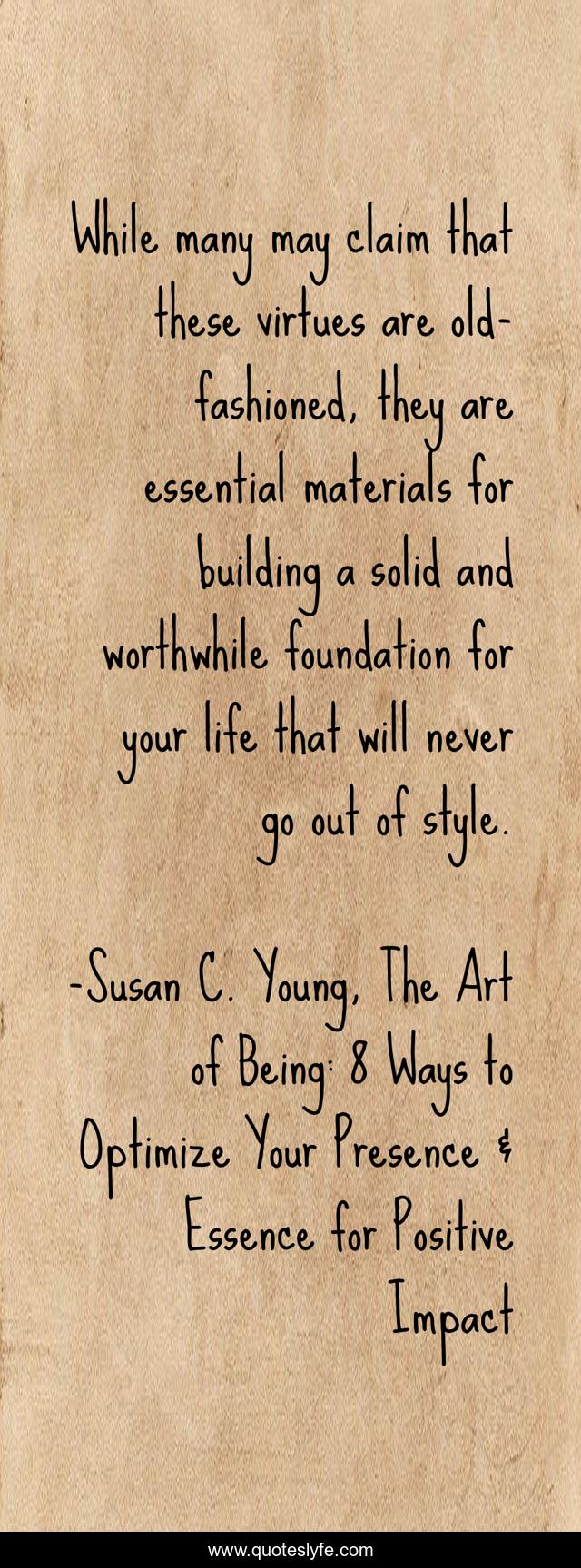 This page presents the quote "While many may claim that these virtues are old-fashioned, they are essential materials for building a solid and worthwhile foundation for your life that will never go out of style.". Author of this quote is Susan C. Young, The Art of Being: 8 Ways to Optimize Your Presence & Essence for Positive Impact. This quote is about confidence, susan-young, relationship, communication-skills, communication, first-impressions, authenticity, trust, integrity,.