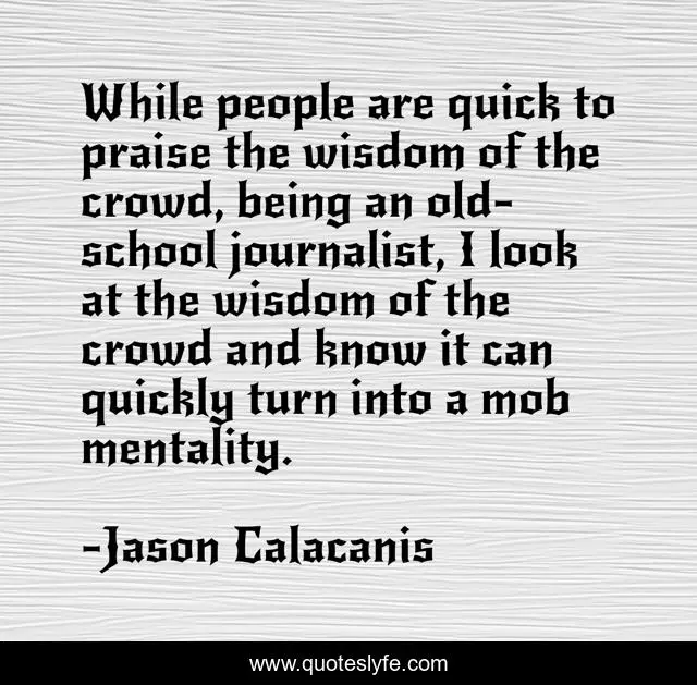 This page presents the quote "While people are quick to praise the wisdom of the crowd, being an old-school journalist, I look at the wisdom of the crowd and know it can quickly turn into a mob mentality.". Author of this quote is Jason Calacanis. This quote is about look, people,.
