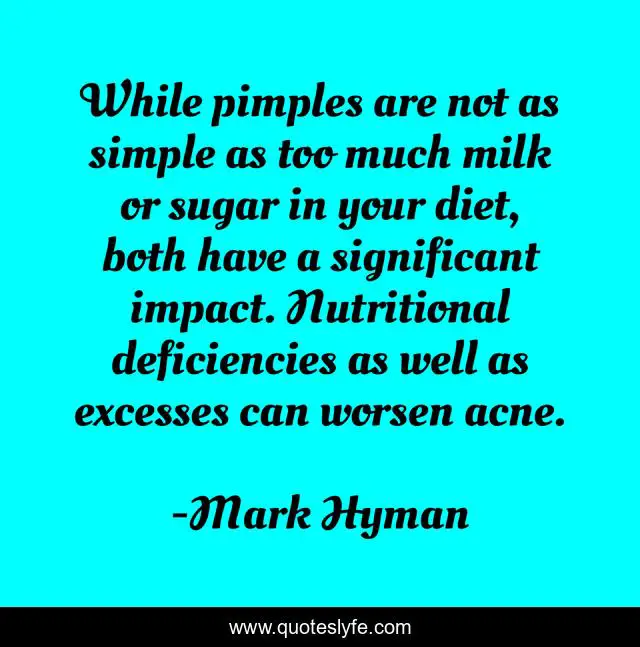 This page presents the quote "While pimples are not as simple as too much milk or sugar in your diet, both have a significant impact. Nutritional deficiencies as well as excesses can worsen acne.". Author of this quote is Mark Hyman. This quote is about simple, impact, sugar,.