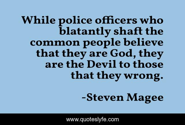 This page presents the quote "While police officers who blatantly shaft the common people believe that they are God, they are the Devil to those that they wrong.". Author of this quote is Steven Magee. This quote is about blatantly, shaft, devil, police, sheriff, people, god, police-state, policeman,.