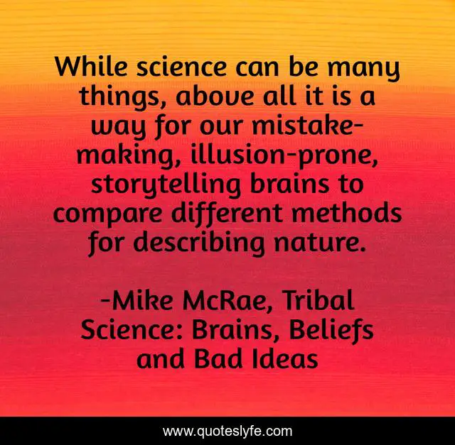 This page presents the quote "While science can be many things, above all it is a way for our mistake-making, illusion-prone, storytelling brains to compare different methods for describing nature.". Author of this quote is Mike McRae, Tribal Science: Brains, Beliefs and Bad Ideas. This quote is about science, scientific-method, nature, storytelling, brain,.