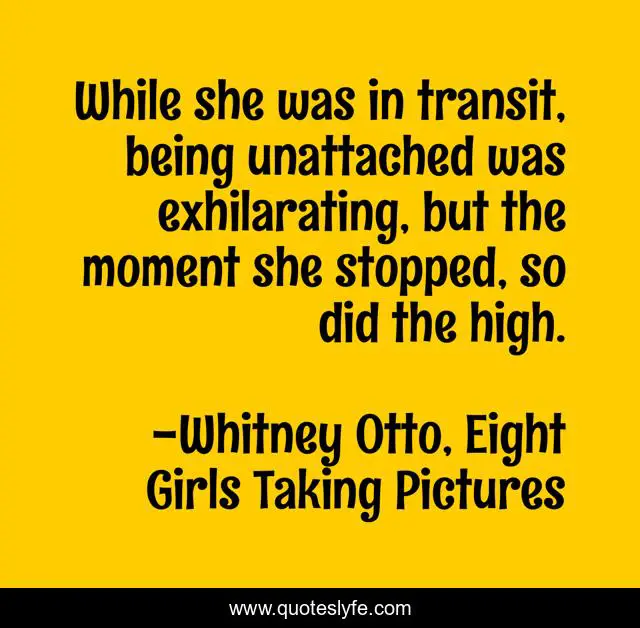 This page presents the quote "While she was in transit, being unattached was exhilarating, but the moment she stopped, so did the high.". Author of this quote is Whitney Otto, Eight Girls Taking Pictures. This quote is about wanderlust, travel, women,.