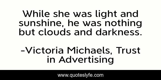 This page presents the quote "While she was light and sunshine, he was nothing but clouds and darkness.". Author of this quote is Victoria Michaels, Trust in Advertising. This quote is about light, sunshine, character, darkness,.