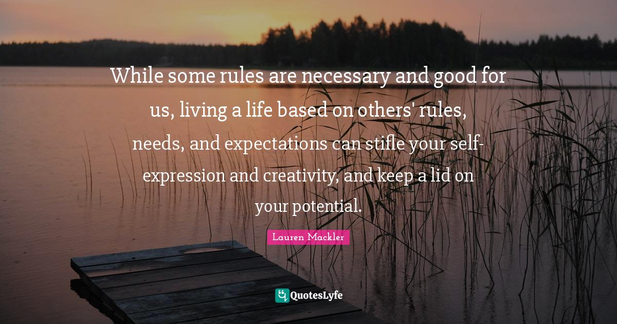 This page presents the quote "While some rules are necessary and good for us, living a life based on others' rules, needs, and expectations can stifle your self-expression and creativity, and keep a lid on your potential.". Author of this quote is Lauren Mackler. This quote is about self, expression, expectations, creativity, needs, life,.