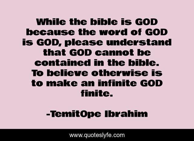 This page presents the quote "While the bible is GOD because the word of GOD is GOD, please understand that GOD cannot be contained in the bible. To believe otherwise is to make an infinite GOD finite.". Author of this quote is TemitOpe Ibrahim. This quote is about enormous, bible, word, description, life-lesson, god, god-lesson, contained, truth,.
