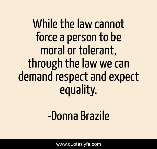 This page presents the quote "While the law cannot force a person to be moral or tolerant, through the law we can demand respect and expect equality.". Author of this quote is Donna Brazile. This quote is about respect, law, moral,.