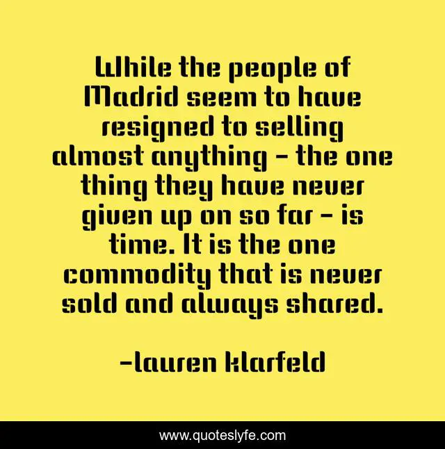 This page presents the quote "While the people of Madrid seem to have resigned to selling almost anything - the one thing they have never given up on so far - is time. It is the one commodity that is never sold and always shared.". Author of this quote is lauren klarfeld. This quote is about sharing, madrid, travel, time, minimalism, happiness,.