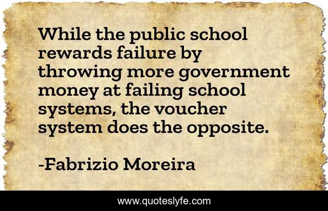 This page presents the quote "While the public school rewards failure by throwing more government money at failing school systems, the voucher system does the opposite.". Author of this quote is Fabrizio Moreira. This quote is about money, school, government,.