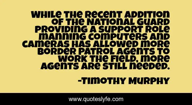 This page presents the quote "While the recent addition of the National Guard providing a support role manning computers and cameras has allowed more Border Patrol agents to work the field, more agents are still needed.". Author of this quote is Timothy Murphy. This quote is about support, work, role,.