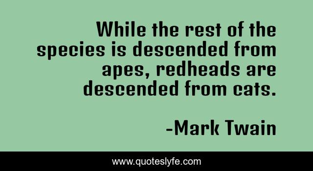 This page presents the quote "While the rest of the species is descended from apes, redheads are descended from cats.". Author of this quote is Mark Twain. This quote is about cats, redheads,.