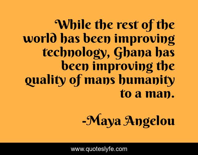 This page presents the quote "While the rest of the world has been improving technology, Ghana has been improving the quality of mans humanity to a man.". Author of this quote is Maya Angelou. This quote is about ghana, the-world, humanity,.
