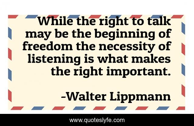 This page presents the quote "While the right to talk may be the beginning of freedom the necessity of listening is what makes the right important.". Author of this quote is Walter Lippmann. .