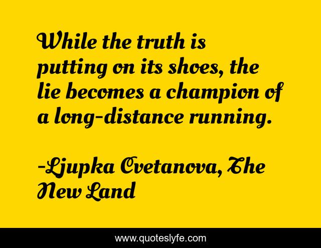 This page presents the quote "While the truth is putting on its shoes, the lie becomes a champion of a long-distance running.". Author of this quote is Ljupka Cvetanova, The New Land. This quote is about lie, aphorism, shoes, fair, distance, telling-the-truth, quotes, lies, sport,.