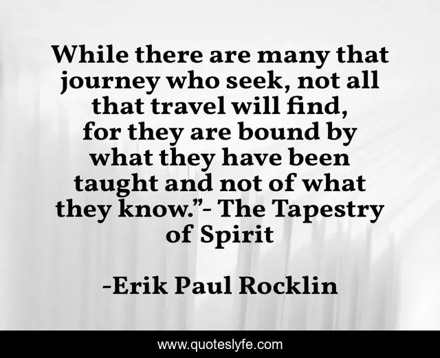 This page presents the quote "While there are many that journey who seek, not all that travel will find, for they are bound by what they have been taught and not of what they know.”- The Tapestry of Spirit". Author of this quote is Erik Paul Rocklin. This quote is about self-realization, self-awareness, inspirational, enthusiasm,.