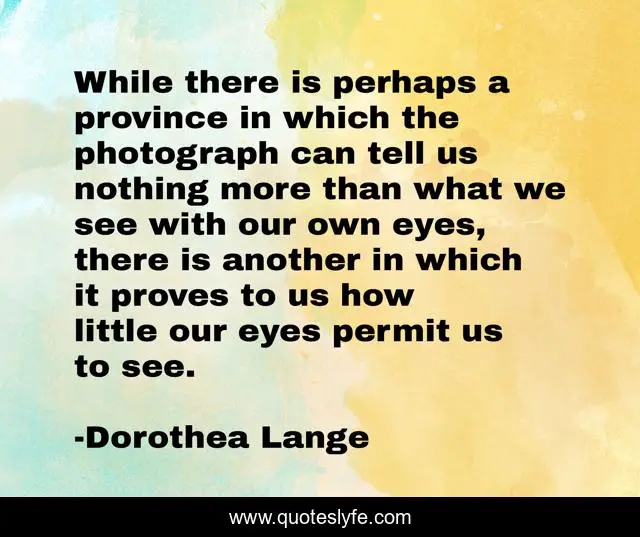 This page presents the quote "While there is perhaps a province in which the photograph can tell us nothing more than what we see with our own eyes, there is another in which it proves to us how little our eyes permit us to see.". Author of this quote is Dorothea Lange. This quote is about photography, cameras, perspective, vision, perception,.