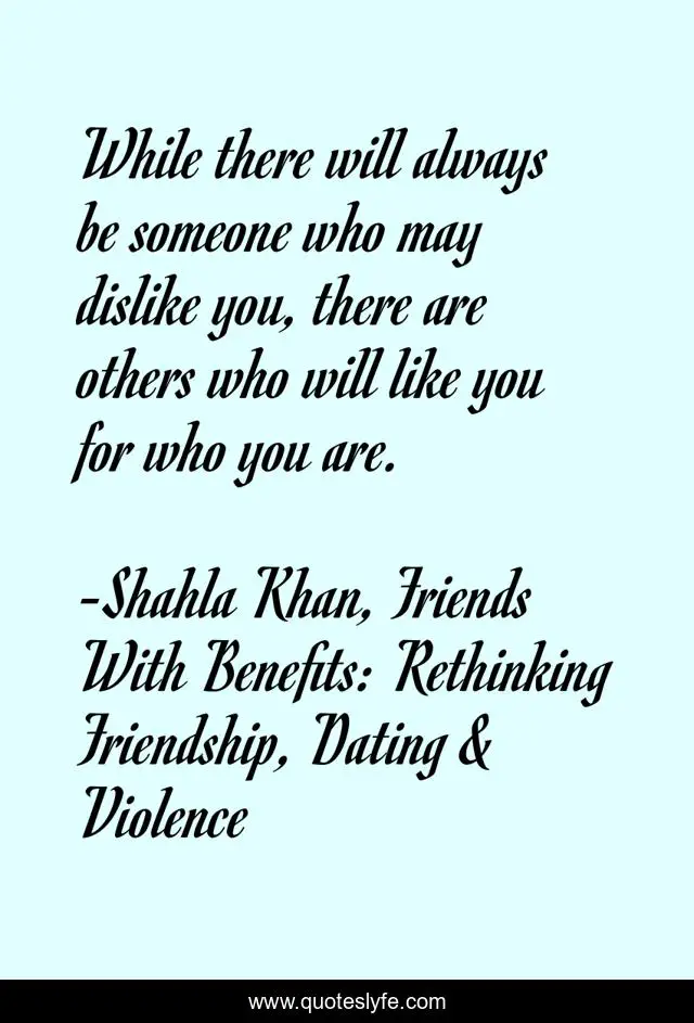 This page presents the quote "While there will always be someone who may dislike you, there are others who will like you for who you are.". Author of this quote is Shahla Khan, Friends With Benefits: Rethinking Friendship, Dating & Violence. This quote is about relationships, self-awareness, inspirational-attitude, inspirational, enthusiasm, truth-of-life, self-esteem,.