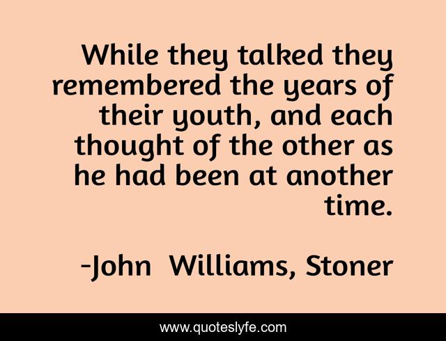 This page presents the quote "While they talked they remembered the years of their youth, and each thought of the other as he had been at another time.". Author of this quote is John Williams, Stoner. This quote is about old-friends, past, perception,.