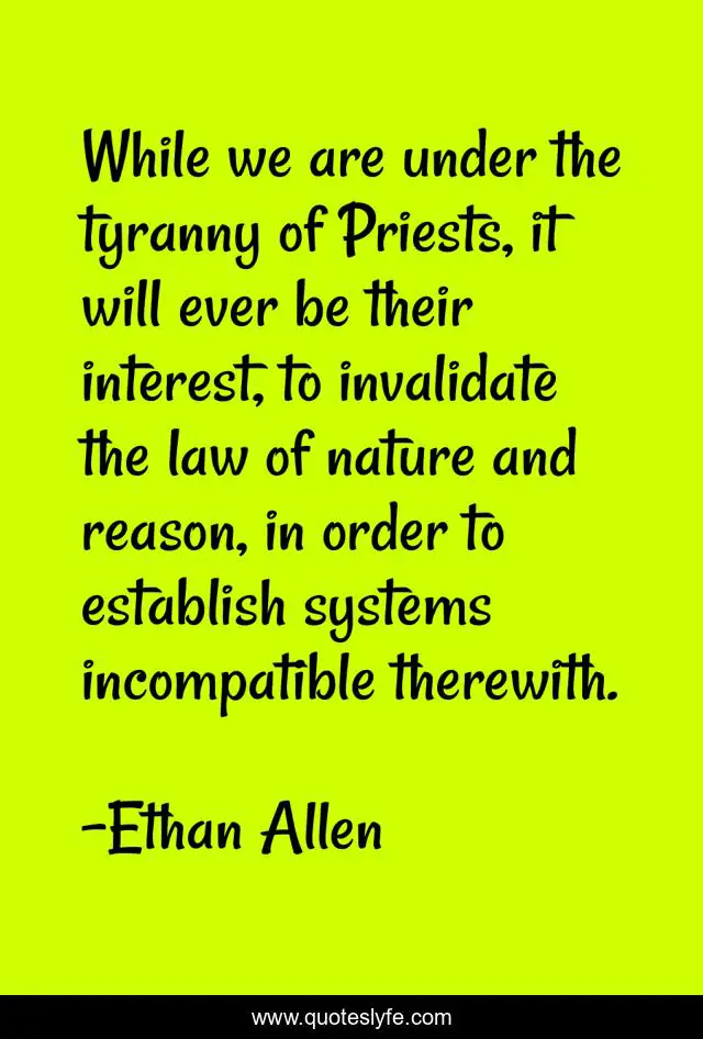 This page presents the quote "While we are under the tyranny of Priests, it will ever be their interest, to invalidate the law of nature and reason, in order to establish systems incompatible therewith.". Author of this quote is Ethan Allen. This quote is about tyranny, reason, law,.
