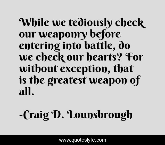 This page presents the quote "While we tediously check our weaponry before entering into battle, do we check our hearts? For without exception, that is the greatest weapon of all.". Author of this quote is Craig D. Lounsbrough. This quote is about heart, patriot, sacrificial, patriotism, sacrifice, fourth-of-july, behaviour, battle, attitude,.