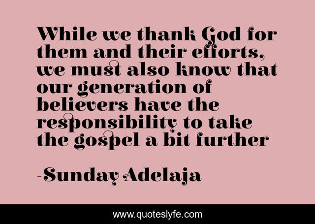 This page presents the quote "While we thank God for them and their efforts, we must also know that our generation of believers have the responsibility to take the gospel a bit further". Author of this quote is Sunday Adelaja. This quote is about them, thank, also, believers, god, generation, we, their, while,.