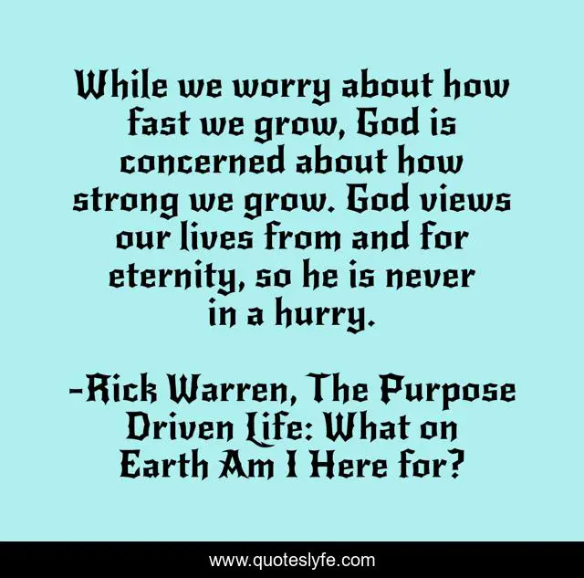 This page presents the quote "While we worry about how fast we grow, God is concerned about how strong we grow. God views our lives from and for eternity, so he is never in a hurry.". Author of this quote is Rick Warren, The Purpose Driven Life: What on Earth Am I Here for?. .