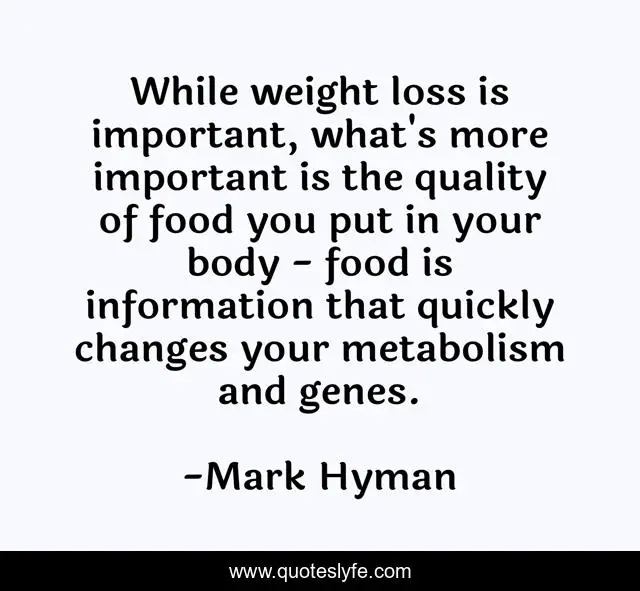 This page presents the quote "While weight loss is important, what's more important is the quality of food you put in your body - food is information that quickly changes your metabolism and genes.". Author of this quote is Mark Hyman. This quote is about changes, quality, loss,.