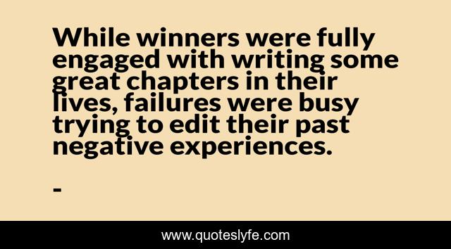 This page presents the quote "While winners were fully engaged with writing some great chapters in their lives, failures were busy trying to edit their past negative experiences.". Author of this quote is . This quote is about chapter, great-chapters, edmond-mbiaka, winner, past-experiences, failure, winners, negative-experiences, failures,.