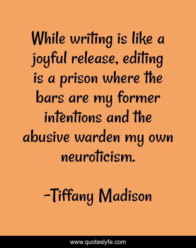 This page presents the quote "While writing is like a joyful release, editing is a prison where the bars are my former intentions and the abusive warden my own neuroticism.". Author of this quote is Tiffany Madison. This quote is about anxiety, joy, editing, writing-life, editors, neurotics, neurosis, editing-humor, prison,.