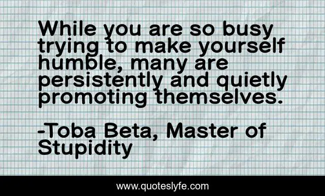 This page presents the quote "While you are so busy trying to make yourself humble, many are persistently and quietly promoting themselves.". Author of this quote is Toba Beta, Master of Stupidity. This quote is about usefulness, humbleness, life, goal,.