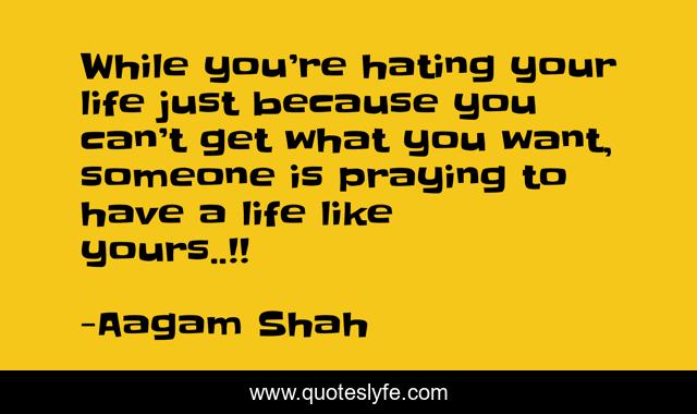 This page presents the quote "While you’re hating your life just because you can’t get what you want, someone is praying to have a life like yours..!!". Author of this quote is Aagam Shah. This quote is about confidence, humor, positive, motivational, optimistic, inspirational, prayer, enthusiasm, life-and-living,.