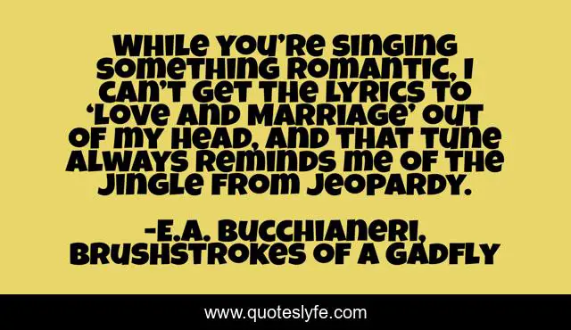 This page presents the quote "While you’re singing something romantic, I can’t get the lyrics to ‘Love and Marriage’ out of my head, and that tune always reminds me of the jingle from Jeopardy.". Author of this quote is E.A. Bucchianeri, Brushstrokes of a Gadfly. This quote is about funny, lovers, love, romantic, lyrics, music, singing, jeopardy, love-song,.