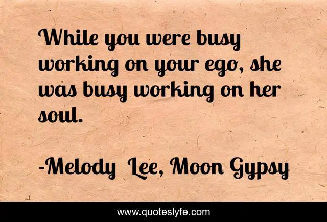 This page presents the quote "While you were busy working on your ego, she was busy working on her soul.". Author of this quote is Melody Lee, Moon Gypsy. This quote is about relationships, inspiration, ego, poetry, soul,.