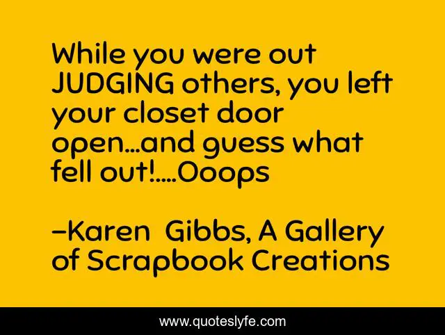 This page presents the quote "While you were out JUDGING others, you left your closet door open...and guess what fell out!....Ooops". Author of this quote is Karen Gibbs, A Gallery of Scrapbook Creations. This quote is about sarcasm, life-lessons, sarcastic-humor,.
