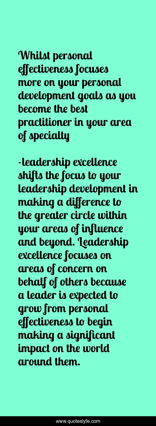 "leadership excellence shifts the focus to your leadership development in making a difference to the greater circle within your areas of influence and beyond. Leadership excellence focuses on areas of concern on behalf of others because a leader is expected to grow from personal effectiveness to begin making a significant impact on the world around them. Quotes." Quoteslyfe.com, 2025. Fri. 05 Dec. 2025. <https://www.quoteslyfe.com/quote/Whilst-personal-effectiveness-focuses-more-on-your-227592>.